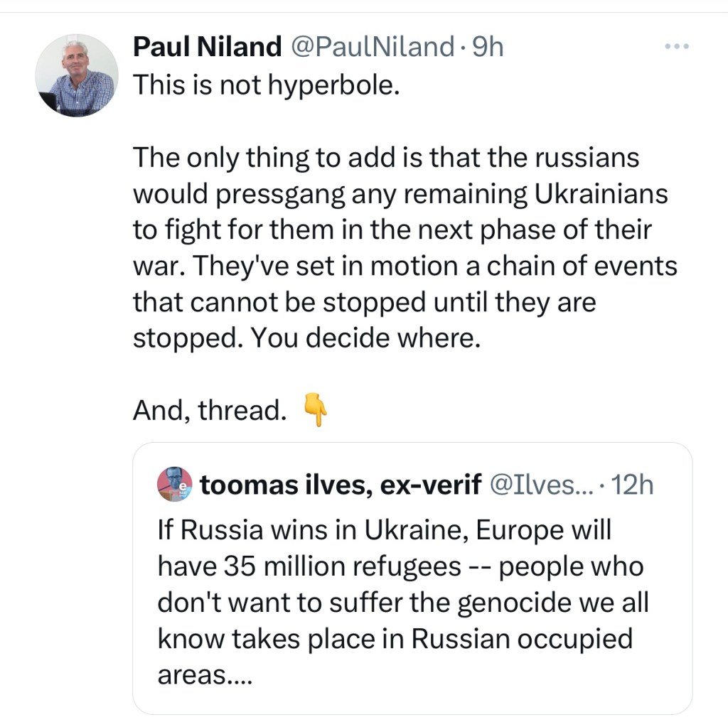 President Biden made a speech on his visit to Kyiv when he said “as long as it takes”. We don’t hear/see that on the news any more. Instead, it is all about the Tucker Putin show, for some reason. God knows. Americans seem to be out of touch with the realities in the rest of the world, or at least they don’t think they need to care, as whatever happens it won’t affect them. This is very naïve, in my view. And, have you seen what that lunatic Trump has been saying lately about NATO. Yup, that club is going to open up. Everyone will be joining in the not so distant future.